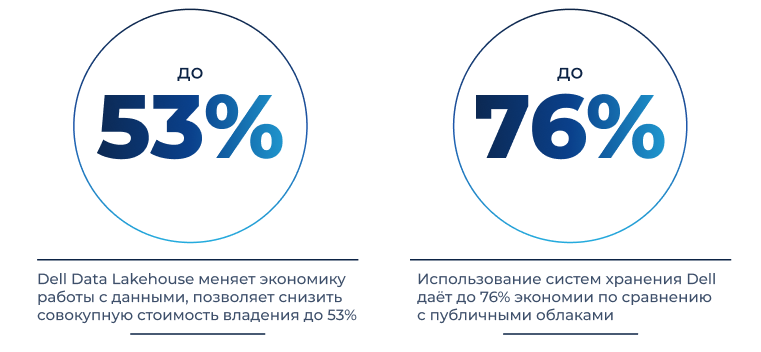 Dell Data Lakehouse меняет экономику работы с данными, позволяет снизить совокупную стоимость владения до 53%. А использование систем хранения Dell даёт до 76% экономии по сравнению с публичными облаками. Это серьёзный аргумент для компаний, которые хотят управлять затратами и при этом не терять в функциональности.